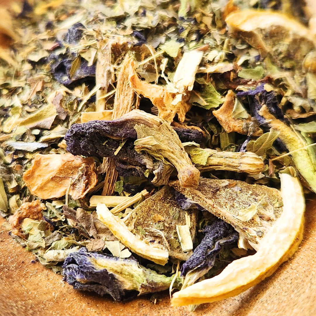 Butterfly pea flower, dried lemon, lemon peel, lemon balm, lemon verbena, passion flower, licorice root.